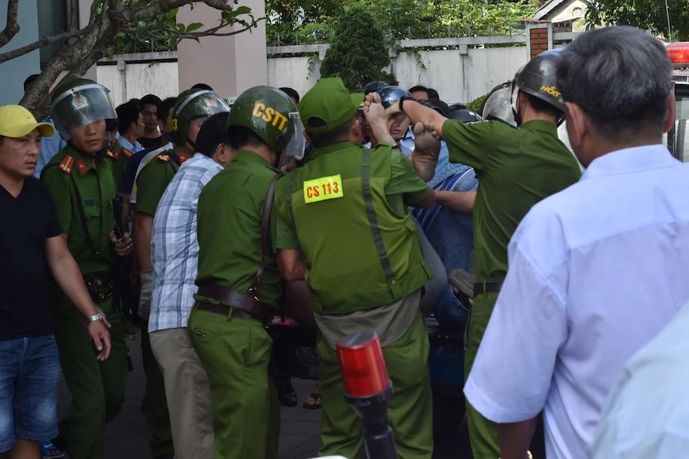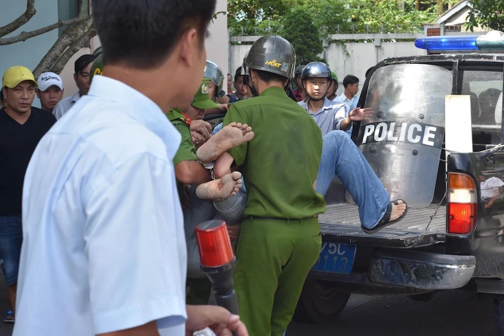 Áp tải đối tượng nghi ngáo đá khống chế con tin ở Huế. Ảnh: NGUYỄN DO.