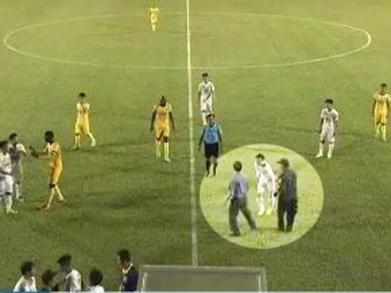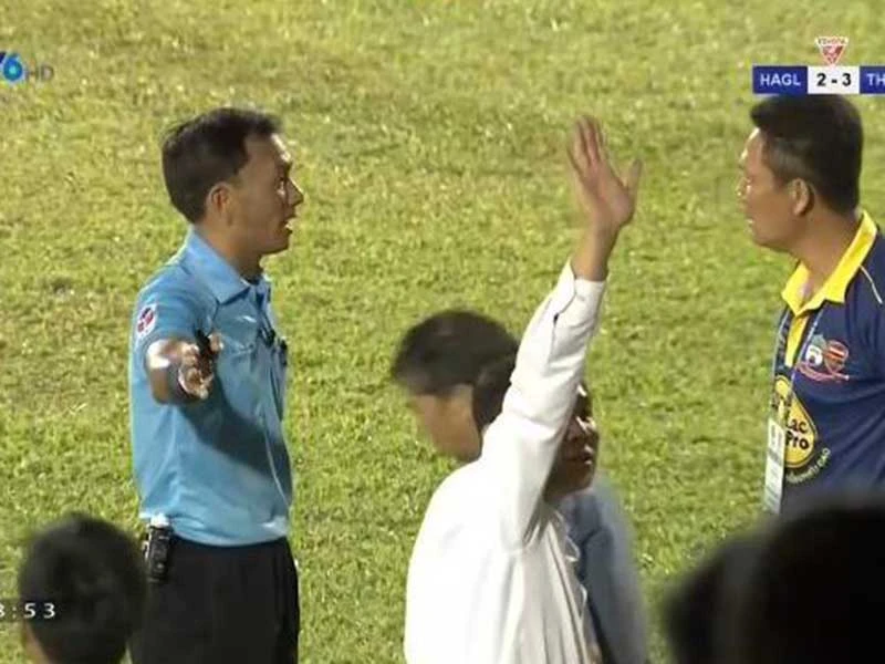 Trong cơn nóng của lãnh đạo đội bóng thì cầu thủ Văn Toàn lại là người tỉnh táo nhất can ngăn và đẩy lãnh đạo của mình về khu kỹ thuật cho trận đấu tiếp diễn. Điểm sáng duy nhất trong trận cầu ồn ào. Ảnh chụp lại từ VTV6