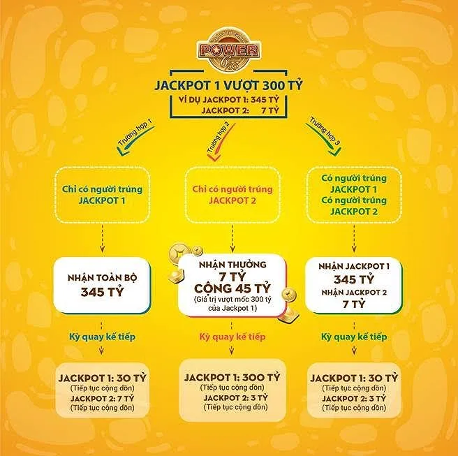 Theo đại diện Vietlott, khi Jackpot 1 của Power 6/55 cán mốc 300 tỉ đồng sẽ có 3 trường hợp trả thưởng xảy ra dưới đây (ví dụ được đưa ra ở đây khi Jackpot 1 vượt 300 tỉ đồng (Jackpot 1 đạt 345 tỉ đồng, Jackpot 2 đạt 7 tỉ đồng):