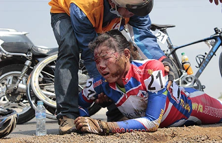 Ở chặng đua khởi động TP mới Bình Dương - Xuân Lộc, tay đua Đồng Tháp Đoàn Thị Thu không may bị té. Cú té đau khiến Thu xây xát khắp người, bùn đá trộn lẫn máu tươi tuôn ướt đẫm mặt. Những người chứng kiến thấy rất xót xa nhưng với cô bé sinh năm 1992 như không có chuyện gì xảy ra. Với Thu, chuyện té trên đường đua cũng thường như cơm bữa đến độ cô không thể nhớ hết mình đã bao nhiêu lần không may bị “đo đường”.