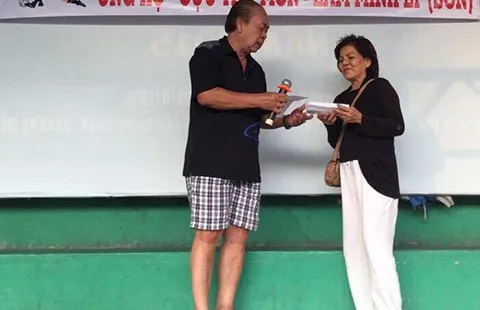 Cựu danh thủ Võ Thành Sơn đại diện trao tiền đóng góp từ giải đấu từ thiện cho gia đình thủ môn Minh Lý. Ảnh: CÔNG TUẤN