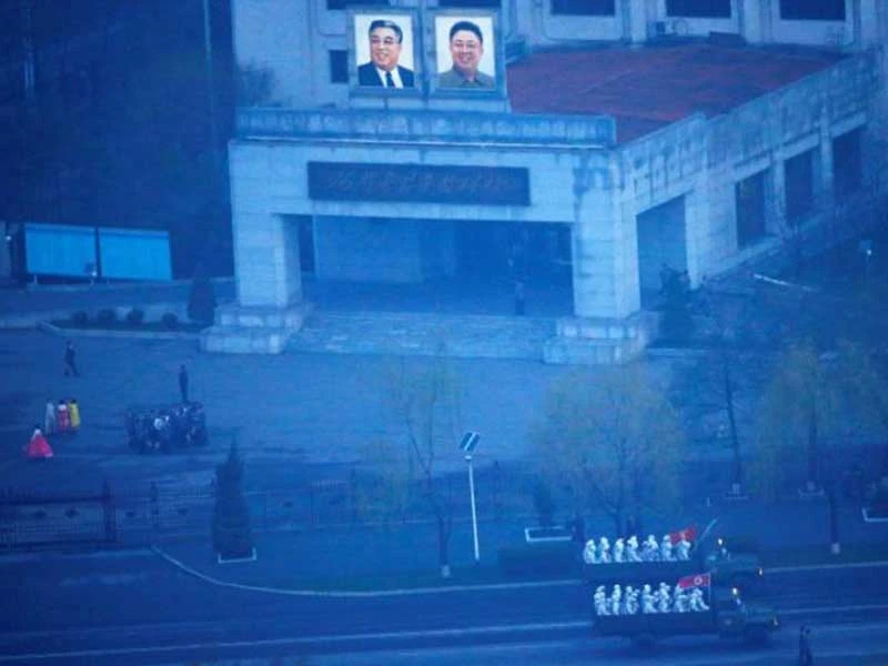 Các xe quân sự chở lính Triều Tiên di chuyển qua thủ đô Bình Nhưỡng tờ mờ sáng 15-4-2017.Ảnh: REUTERS