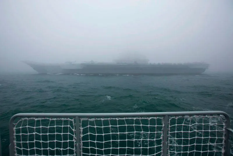 Tàu sân bay của Hải quân Quân đội Giải phóng Nhân dân Trung Quốc (PLA) Liêu Ninh tham gia một cuộc diễu hành hải quân gần Thanh Đảo ở phía đông tỉnh Sơn Đông của Trung Quốc, vào ngày 23-4-2019. Ảnh: AFP.