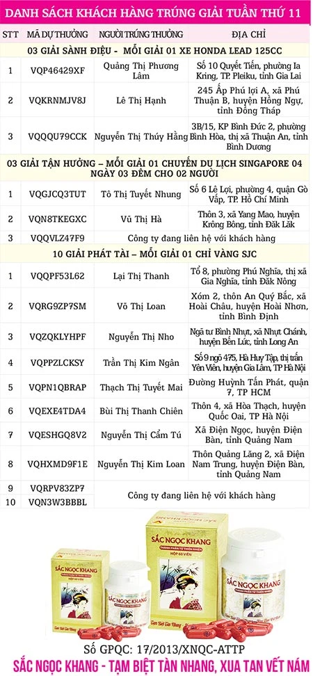 Nhãn hàng Sắc Ngọc Khang xin gửi lời chúc mừng đến 16 khách hàng may mắn tuần thứ 11, chương trình “Mua Sắc Ngọc Khang chính hiệu, nhận quà sành điệu”.
