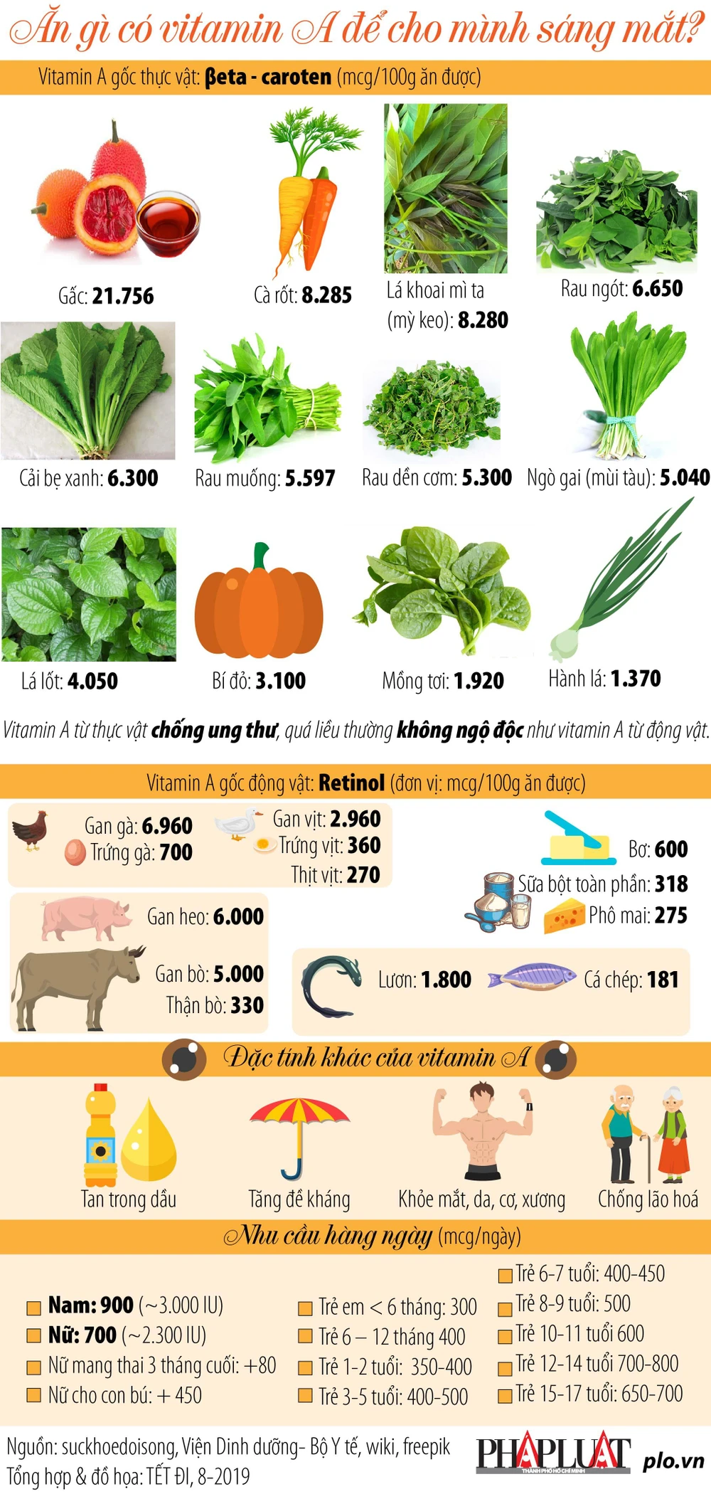 (PLO)- Thiếu vitamin A, nhất là trẻ nhỏ, sẽ bị khô mắt, khô giác mạc, có thể mù vĩnh viễn; chậm tăng cân và chiều cao, ảnh hưởng trí tuệ. Dưới đây là những thực phẩm quen thuộc chứa nhiều vitamin A nguồn gốc từ động vật và thực vật.