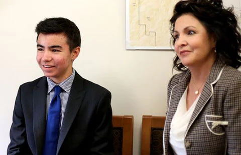 Diego Morris (trái), 14 tuổi và mẹ tại trụ sở bang Oregon (Mỹ) hôm 26-2-2015. Ảnh: ANNA REED