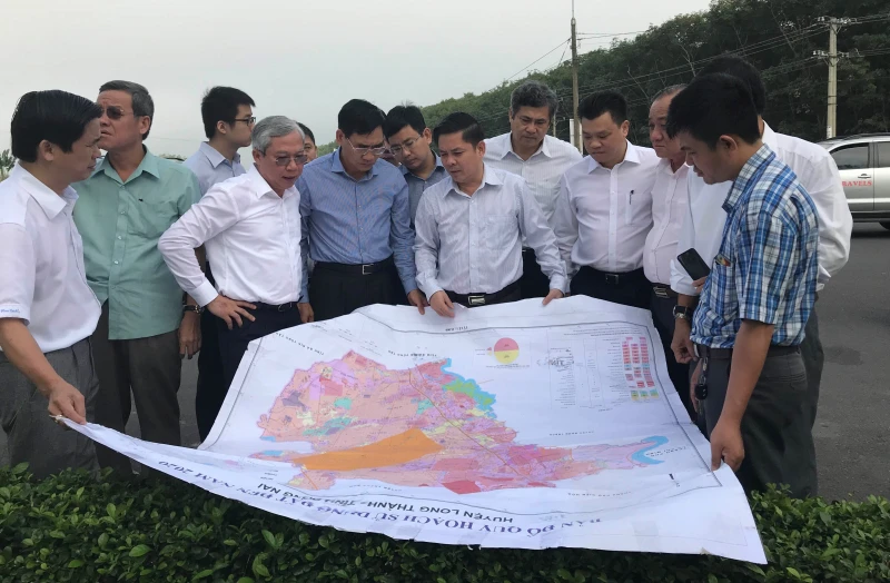 Bộ trưởng Nguyễn Văn Thể và lãnh đạo tỉnh Đồng Nai thị sát tại xã Bình Sơn, huyện Long Thành, Đồng Nai sáng 8-11. Ảnh: Báo Giao Thông