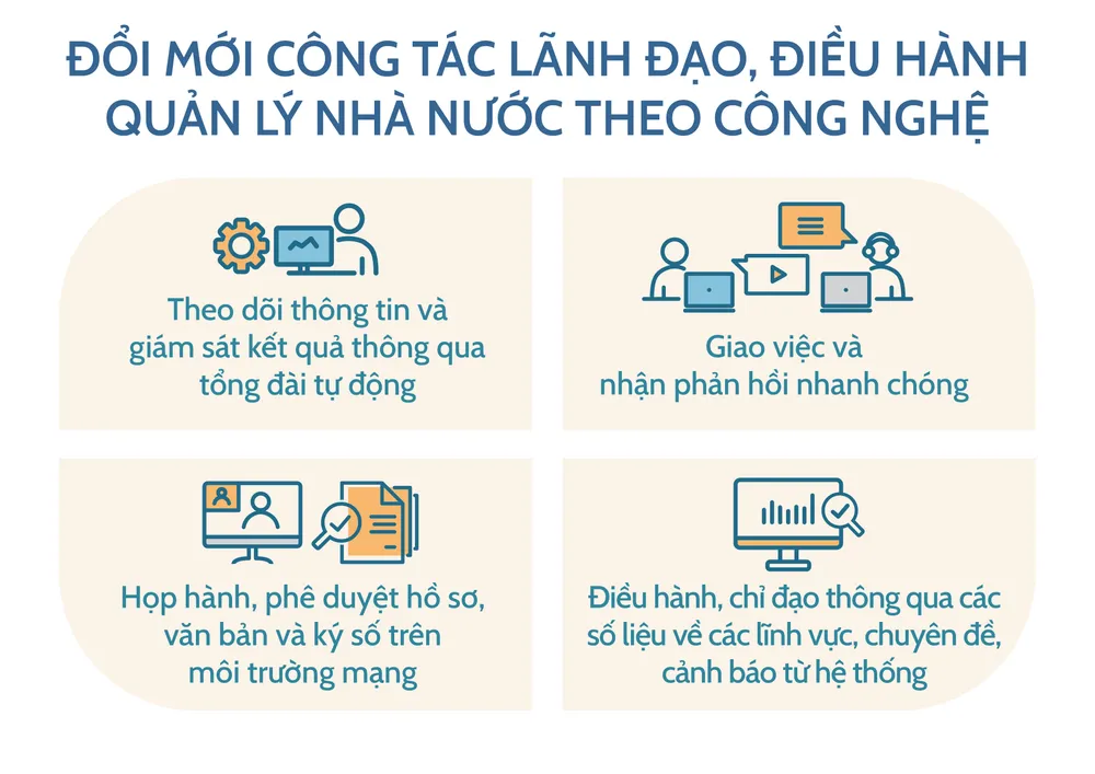Với trung tâm chỉ huy, có thể hình dung lãnh đạo có thể thông qua hệ thống ứng dụng để: (i) Theo dõi thông tin, giám sát kết quả thông qua tổng đài tự động; (ii) Giao việc và nhận phản hồi nhanh chóng; (iii) Họp hành, phê duyệt hồ sơ, văn bản và ký số trên môi trường Internet; (iv) Điều hành, chỉ đạo thông qua các số liệu về các lĩnh vực, chuyên đề, cảnh báo từ hệ thống. Với hệ thống giám sát công việc bằng công nghệ, một lãnh đạo quận có thể dễ dàng giao việc và giám sát hiệu quả một cách tiện lợi, chính xác. Cùng với cơ chế khuyến khích, những cá nhân đạt KPIs tốt sẽ được tuyên dương, khen thưởng hoặc (và) được tạo điều kiện để có thể phát huy khả năng của mình ở vị trí cao hơn. Trái lại, sự chủ quan, chậm trễ, cứng nhắc, thiếu trách nhiệm, làm sai quy định - hướng dẫn... sẽ chịu chế tài.