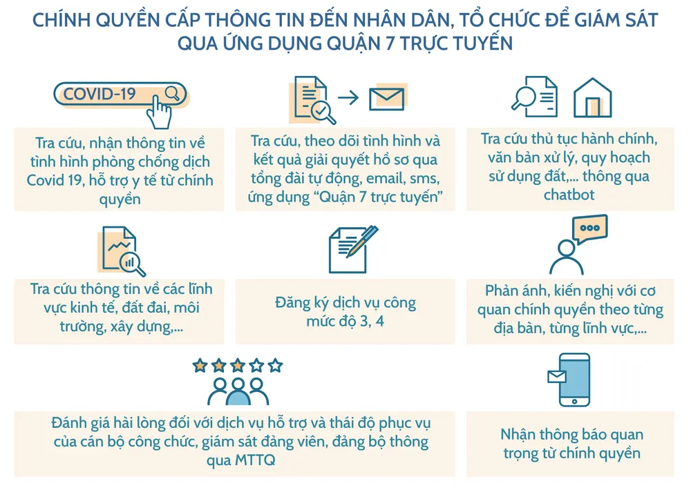 Bài toán quản lý thứ hai mà chính quyền TP muốn áp dụng công nghệ để giải quyết chính là nâng cao hiệu quả sự phục vụ của chính quyền với người dân. Như một lãnh đạo của quận 7 chia sẻ về hoạt động của trung tâm chỉ huy, dịch bệnh xuất hiện khiến người dân rơi vào khủng hoảng và họ có thể tìm kiếm sự giúp đỡ từ chính quyền, các cơ quan, đoàn thể ở địa phương bất kỳ lúc nào. “Bất kể ngày đêm, người dân có thể gọi điện thoại để yêu cầu hỗ trợ thì chúng ta cần có giải pháp để giúp đỡ họ” - vị này chia sẻ.