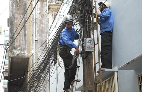 Lắp đặt dịch vụ viễn thông cho khách hàng tại TP.HCM. Ảnh: HTD