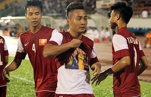 Tuấn Tài mừng bàn thắng độc đáo sau bàn nâng tỉ số 2-0. Ảnh: XUÂN HUY