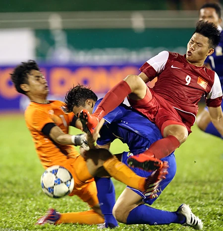Pha bóng quyết liệt trong trận U-21 báo Thanh Niên thắng U-21 Thái Lan 4-2. Ảnh: XUÂN HUY