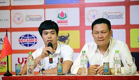 HLV Quốc Tuấn và ngôi sao Công Phượng trong cuộc hop báo. Ảnh Nguyên Huy
