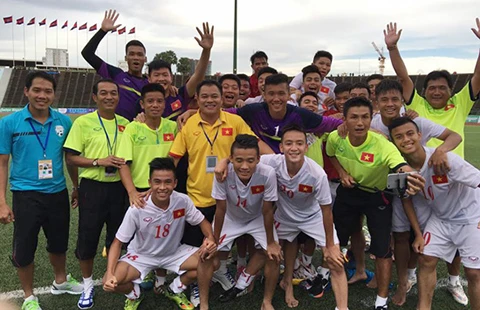 Toàn bộ ban huấn luyện và các cầu thủ U-16 Việt Nam mừng với ba chiến thắng đậm sớm giành quyền vào bán kết. Ảnh: CTP
