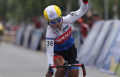 An Seonjin một mình về đích, rút ngắn cách biệt với áo vàng chỉ còn năm giây. Ảnh: MQ