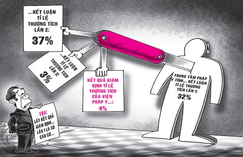 Bốn tháng sau, cũng chính trung tâm pháp y này có kết luận giám định mới với thương tật chỉ có 3%, trong đó chấn thương mắt là 0%.