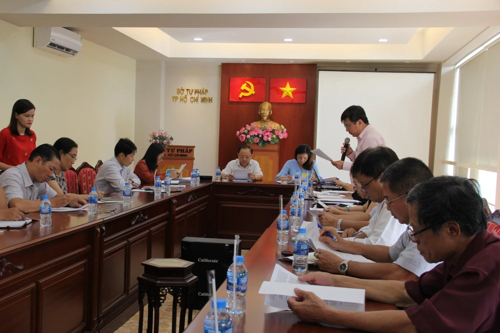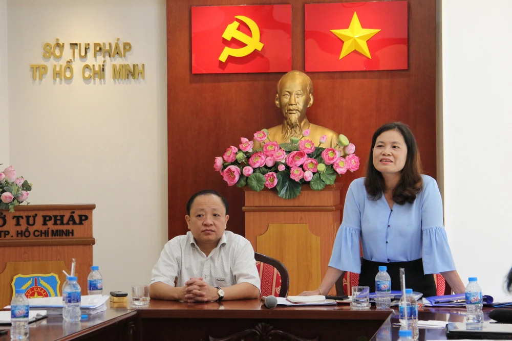 Ông Vũ Văn Đoàn, Cục phó Cục Bổ trợ tư pháp-Bộ Tư pháp và bà Nguyễn Thị Hồng Hạnh, Phó Giám đốc Sở Tư pháp TP.HCM chủ trì buổi làm việc.