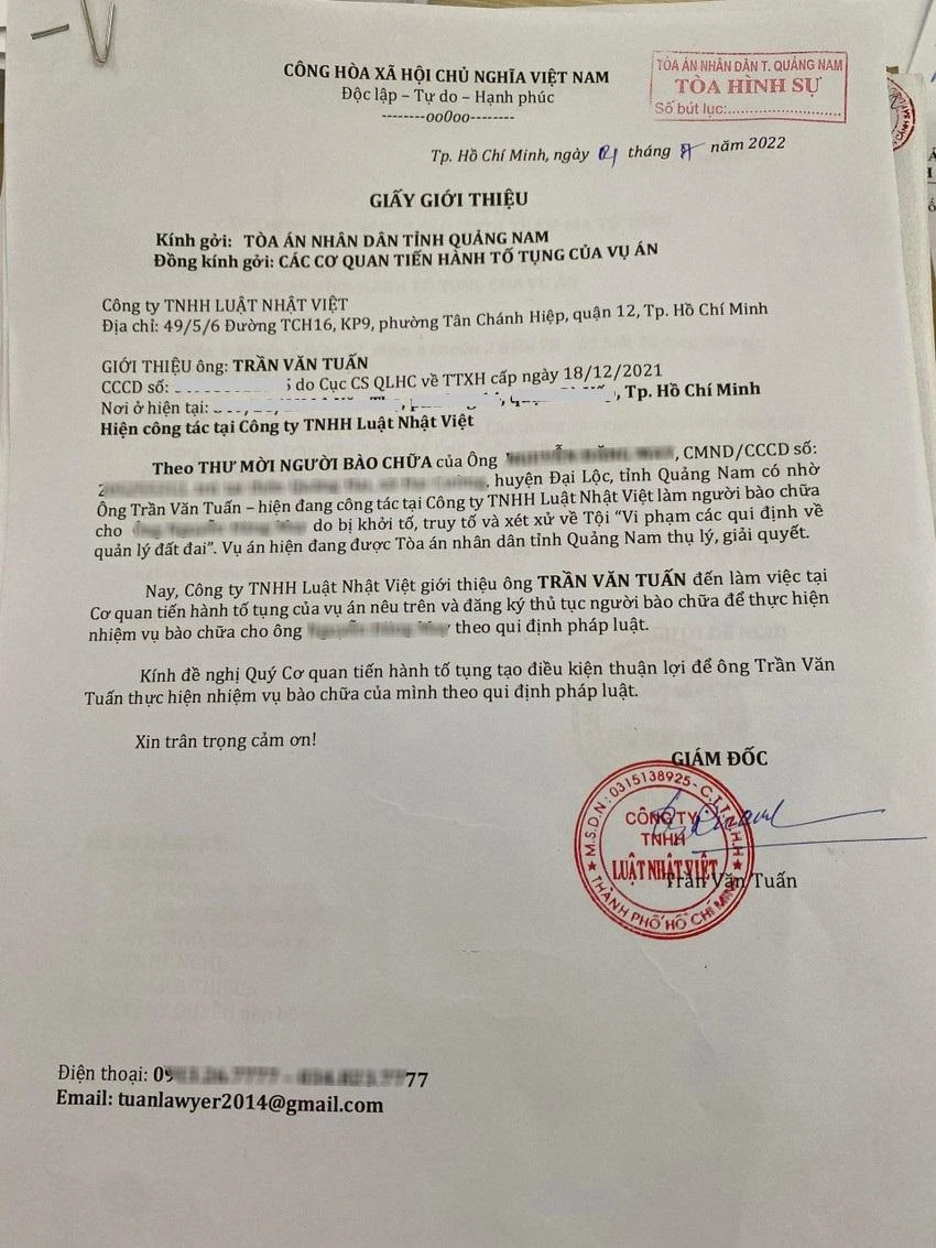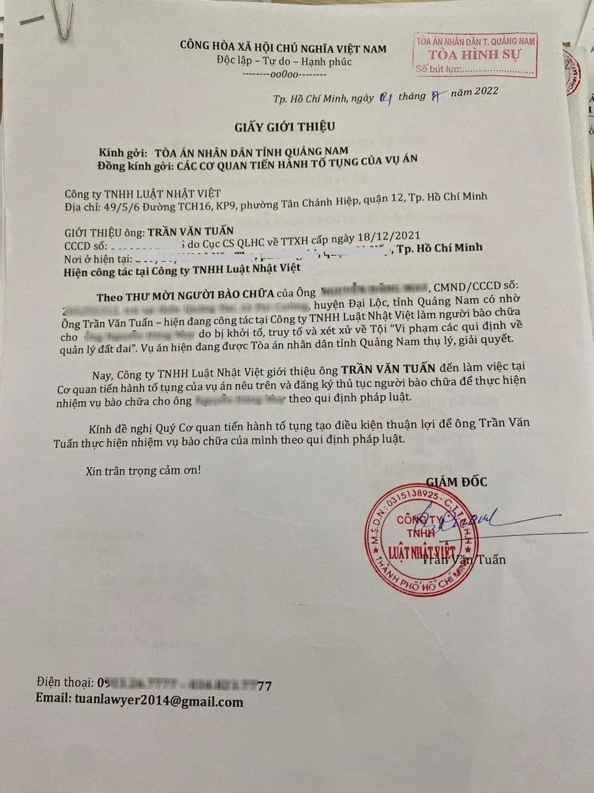 Giấy của Công ty TNHH Luật Nhật Việt (do ông Tuấn làm giám đốc ký) giới thiệu chính ông Tuấn liên hệ với các cơ quan tiến hành tố tụng để làm người bào chữa trong vụ án mà ông M là bị cáo.