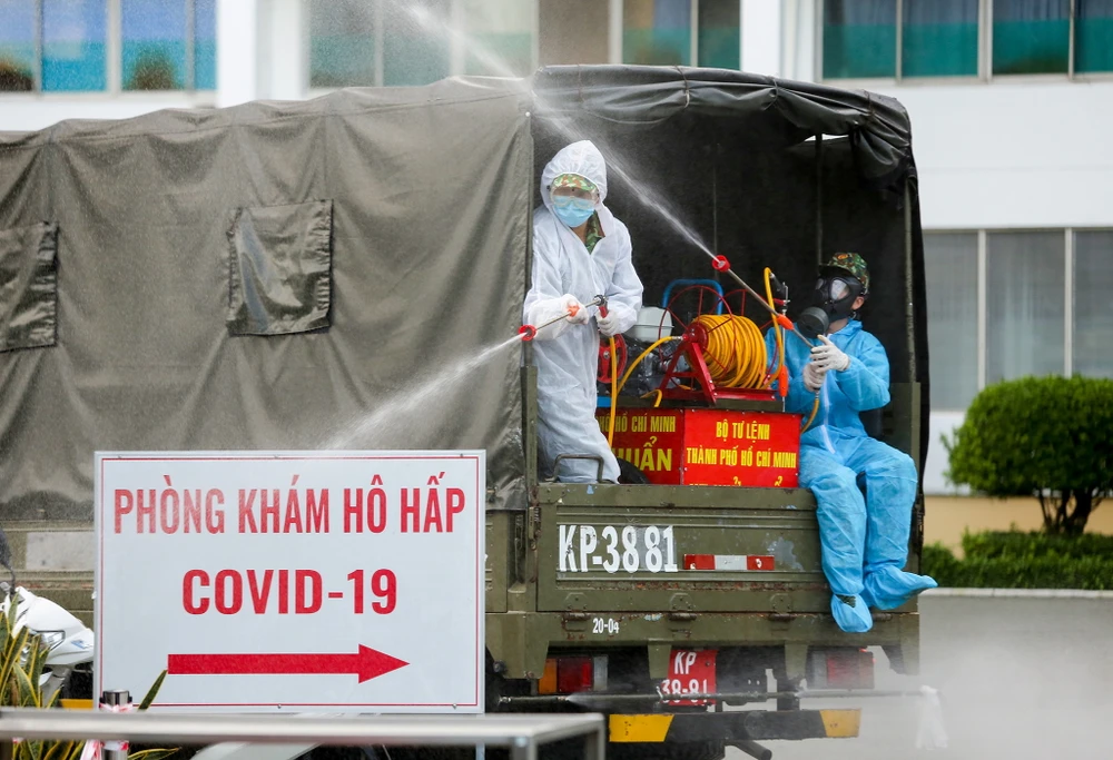 Phun khử khuẩn toàn bệnh viện Bệnh nhiệt đới trong chiều 13-6. Ảnh: Nguyệt Nhi