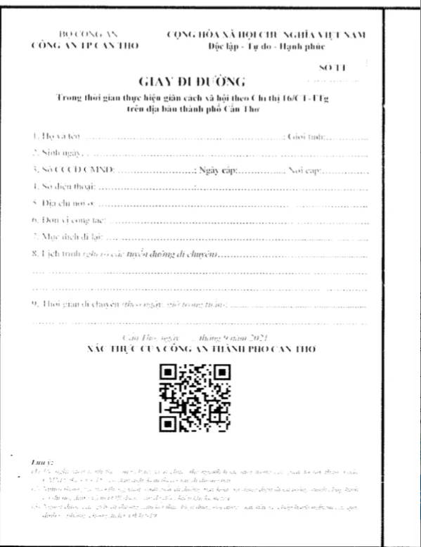Mẫu giấy đi đường đường có mã QR do Công an TP Cần Thơ cấp