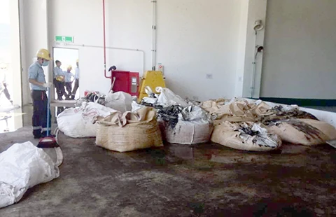 Công nhân ở dự án Formosa Hà Tĩnh đang thu gom chất thải đổ bao để chở đi đổ. Ảnh: NL