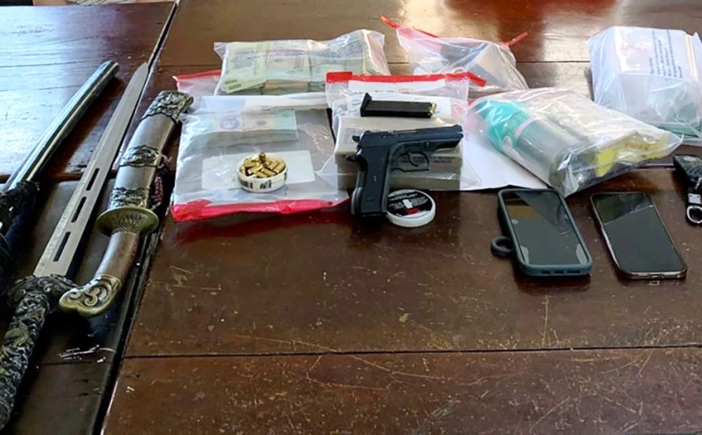 Công an còn phát hiện thu giữ một khẩu súng với 25 viên đạn, bảy cục dạng sừng (nghi là sừng tê giác) có khối lượng 711,915 g, hai ô tô hiệu Mercedes và Lexus 350.