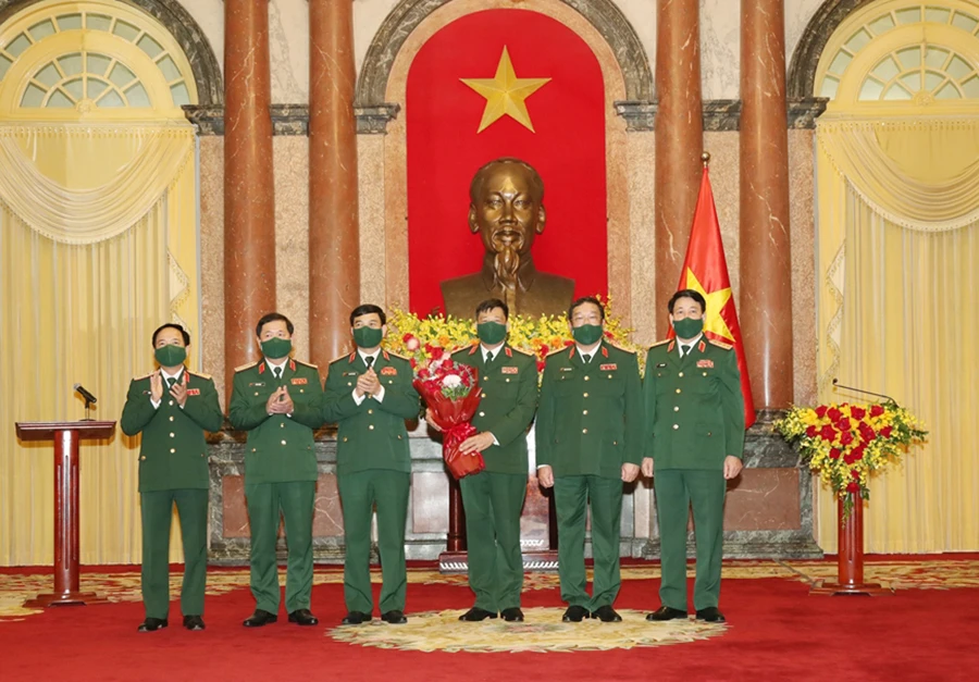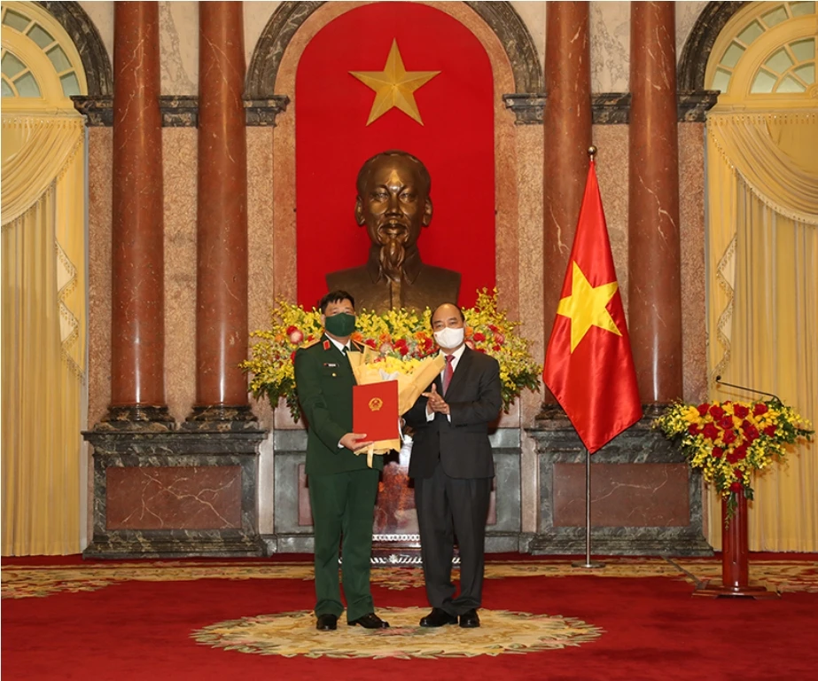 Chủ tịch nước Nguyễn Xuân Phúc trao Quyết định thăng quân hàm và tặng hoa chúc mừng Thượng tướng Trần Việt Khoa. Ảnh: MOD