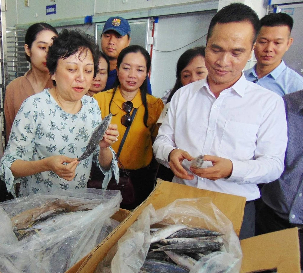 Bà Phạm Khánh Phong Lan (bìa trái) đang thị sát một doanh nghiệp cung cấp thủy sản cho TP.HCM. Ảnh: TRẦN NGỌC