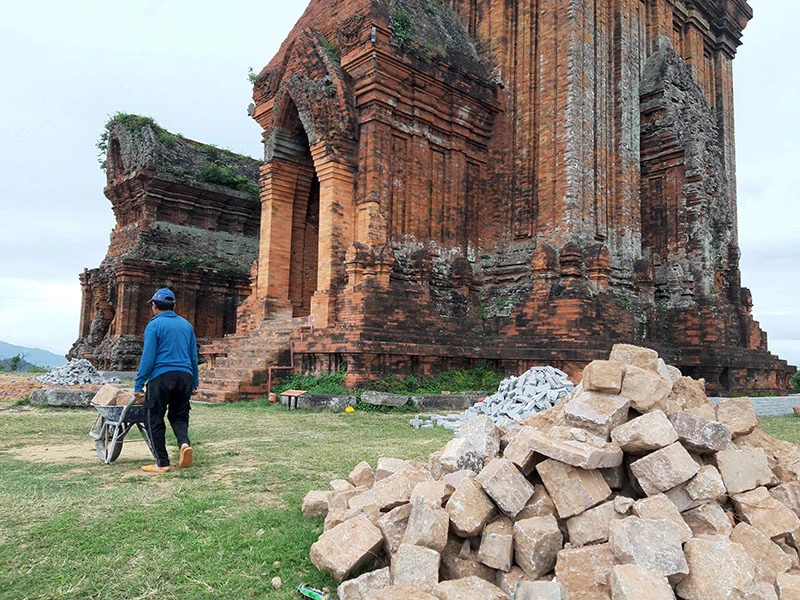 Quần thể tháp Bánh Ít có dấu hiệu bị xâm hại do thi công tu bổ, tôn tạo. Ảnh: NO