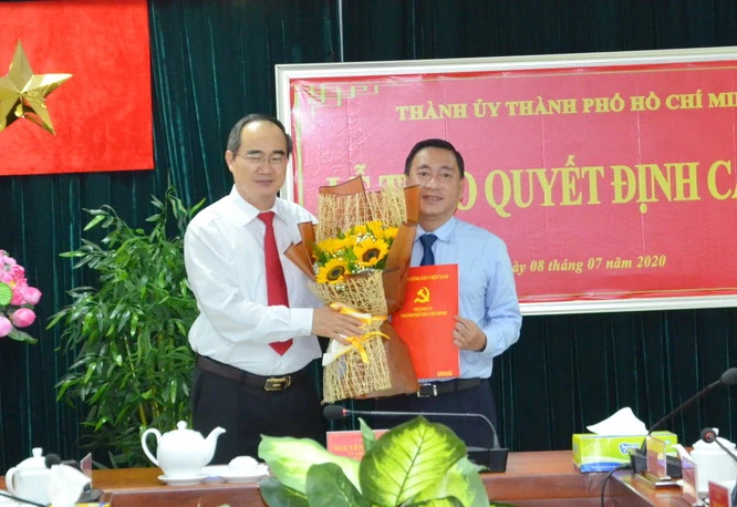 Bí thư Thành ủy Nguyễn Thiện Nhân thay mặt Ban thường vụ Thành ủy TP.HCM trao quyết định điều động cán bộ cho ông Phạm Thành Kiên. Ảnh VH
