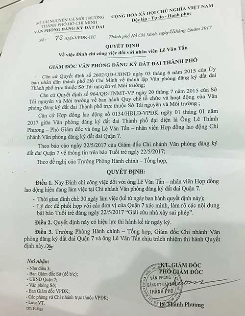Từ những thông tin ban đầu nêu trên, ngay trong sáng 22-5, VPĐKĐĐ TP cũng đã ban hành quyết định tạm đình chỉ công tác với cá nhân ông Tấn trong vòng 30 ngày để làm rõ vụ việc.