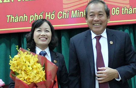 Chánh án TAND Tối cao chúc mừng tân chánh án TAND TP.HCM Ung Thị Xuân Hương. Ảnh: HY