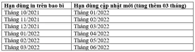 Ngày 22-10, Cục Quản lý Dược - Bộ Y tế ban hành Công văn đồng ý tăng hạn dùng của vaccine Comirnaty ở điều kiện bảo quản từ -90 độ C đến -60 độ C. Theo đó, cập nhật hạn dùng của các lô vaccine có hạn dùng trên nhãn 6 tháng như sau: hạn sử dụng in trên bao bì là tháng 10-2021, tháng 11-2021, tháng 12-2021, tháng 1-2022, tháng 2-2022, tháng 3-2022 thì hạn dùng cập nhật mới (tăng thêm 3 tháng) lần lượt là: tháng 1-2022, tháng 2-2022, tháng 3-2022, tháng 4-2022, tháng 5-2022, tháng 6-2022.