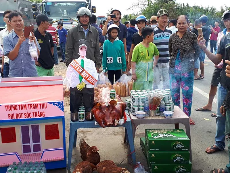 | Cúng mừng xả trạm Sáng 11-1, khi BOT Sóc Trăng xả trạm, khoảng 100 tài xế và người dân tụ tập gần trạm BOT Sóc Trăng tổ chức cúng mừng xả trạm. Họ lập bàn cúng cách trạm khoảng 100 m. Đồ cúng ngoài một con heo quay, ba con gà sống, bia còn có mô hình trạm BOT bằng giấy và hình nộm đề tên Nguyễn Duy Dương - người điều hành trạm BOT Sóc Trăng. Trong lúc này có gần chục ô tô các loại đỗ gần trạm, trong tư thế sẵn sàng “xuất trận” nếu trạm tổ chức thu phí lại. Từ sáng, công an trật tự địa phương có mặt tại BOT Sóc Trăng để đảm bảo an ninh trật tự. Lực lượng công an không cấm việc cúng, chỉ yêu cầu các tài xế và người dân không để ảnh hưởng đến trật tự, giao thông. Suốt ngày qua, trạm BOT Sóc Trăng chính thức ngưng thu phí. Năm ngày căng thẳng Ngày 7-1, BOT Sóc Trăng bị các tài xế phản đối lần đầu tiên. Nhiều tài xế đưa xe vào làn đường thu phí, không chịu mua vé và đề nghị trạm giải thích việc bán vé này. Họ cho rằng đã đóng phí bảo trì đường bộ nên không phải trả phí khi đi trên quốc lộ 1 nữa. Trong ngày này, trạm buộc xả trạm hai lần do ùn tắc giao thông kéo dài. Ngày 8-1, các tài xế tiếp tục phản đối nhiều lần trong ngày. Một tài xế bị đánh. Chiều cùng ngày, Sở TT&TT họp báo thông tin cụ thể về tình hình BOT Sóc Trăng. Theo ông Nguyễn Văn Phương, Chủ tịch HĐQT BOT quốc lộ Sóc Trăng, trước mắt miễn phí cho toàn bộ xe buýt và các xe ưu tiên theo quy định. Còn xe khu vực gần trạm BOT sẽ rà soát, giảm miễn trong tháng 1-2018. Ngày 9-1, BOT Sóc Trăng tiếp tục diễn ra việc tài xế phản đối việc thu phí trong khi nhà trạm quyết giữ lối ứng xử mềm dẻo, thu được ai thì thu, kẹt xe quá thì cho xả trạm. Ngày 10-1, nhiều tài xế đâm hỏng barie để vượt trạm. Để đảm bảo giao thông BOT Sóc Trăng phải xả trạm. Trưa cùng ngày, các tài xế rước đội lân đến gần BOT Sóc Trăng để biểu diễn. Sáng 11-1, nhiều tài xế mang heo quay, gà đến gần trạm để cúng mừng BOT Sóc Trăng xả trạm theo chỉ đạo của UBND tỉnh Sóc Trăng. |