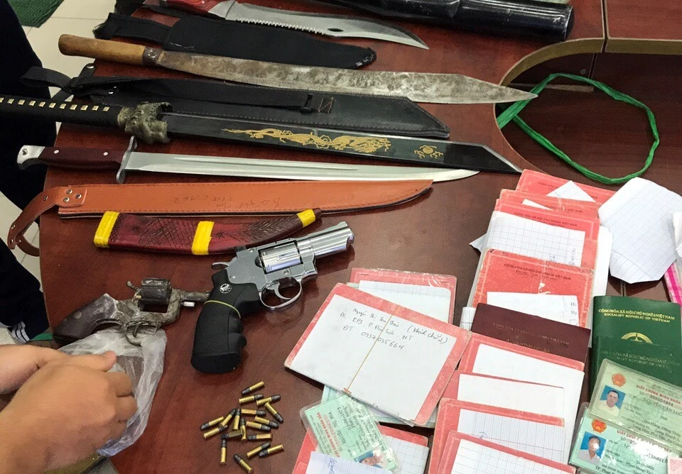 Khám xét nơi ở của nhóm người này, cơ quan công an thu giữ hai khẩu súng, 30 viên đạn, năm cây mã tấu cùng nhiều giấy tờ, sổ sách, tờ rơi, giấy mượn tiền... liên quan đến việc cho vay tín dụng đen.