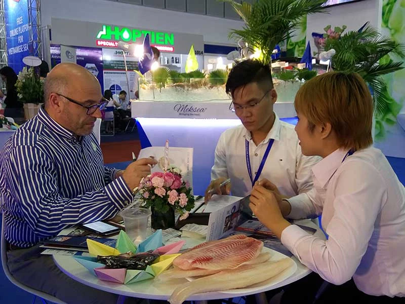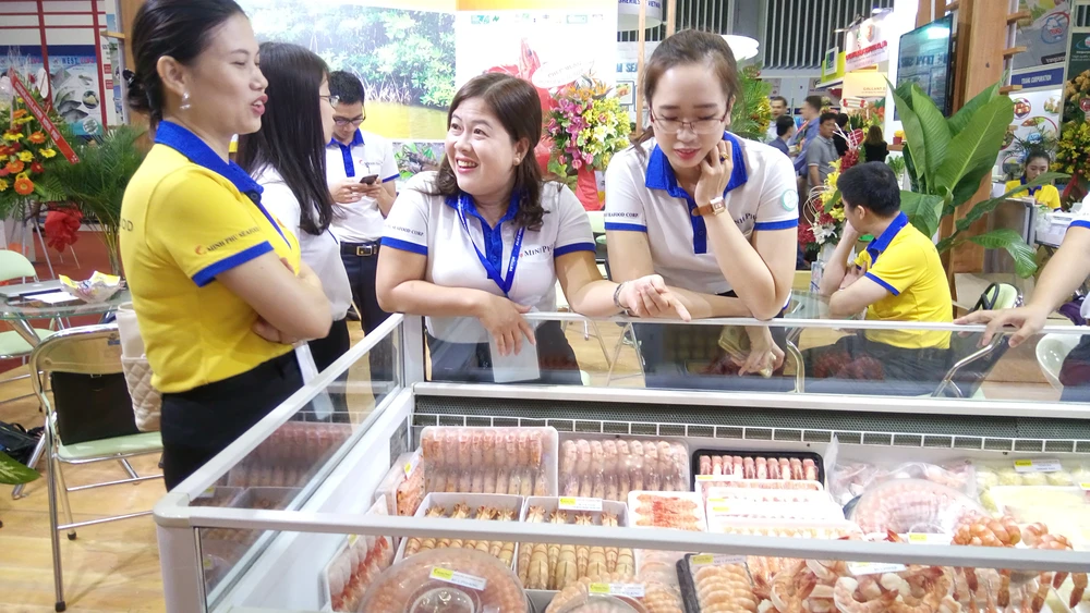 Doanh nghiệp thủy sản sẽ giảm bớt được gánh nặng nhờ giảm phí. Trong ảnh: Đối tác nước ngoài đang tìm hiểu mặt hàng thủy sản Việt Nam. Ảnh: QUANG HUY