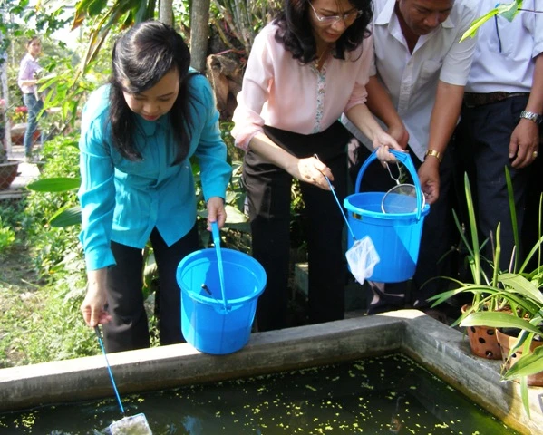 Bộ trưởng Bộ Y tế Nguyễn Thị Kim Tiến (bìa trái) đang kiểm tra hoạt động phòng, chống SXH trên địa bàn huyện Bình Chánh (TP.HCM). Ảnh: TRẦN NGỌC