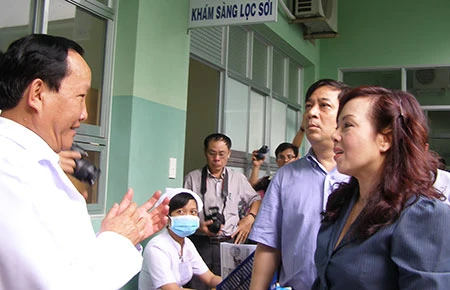 Bộ trưởng Bộ Y tế Nguyễn Thị Kim Tiến đang trao đổi phân tuyến trẻ mắc sởi với lãnh đạo BV quận Bình Tân. Ảnh: TRẦN NGỌC