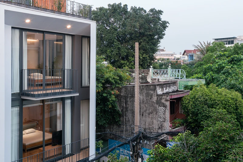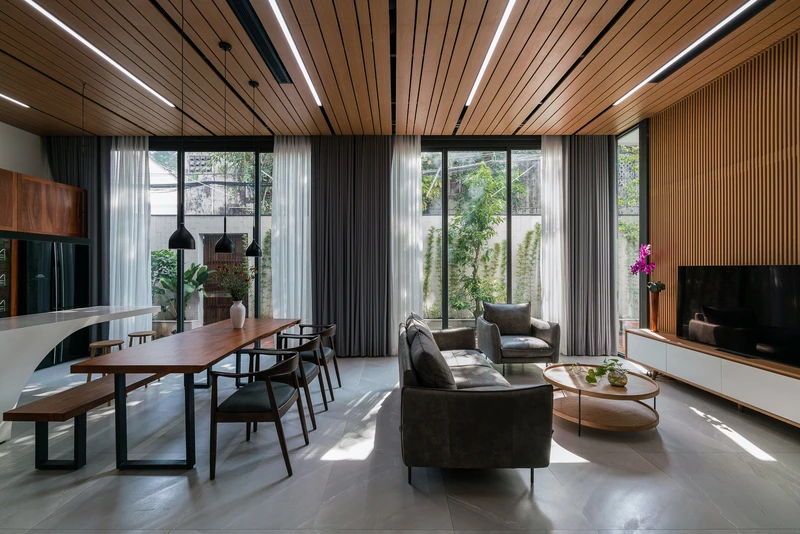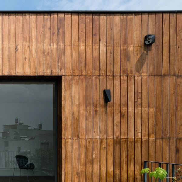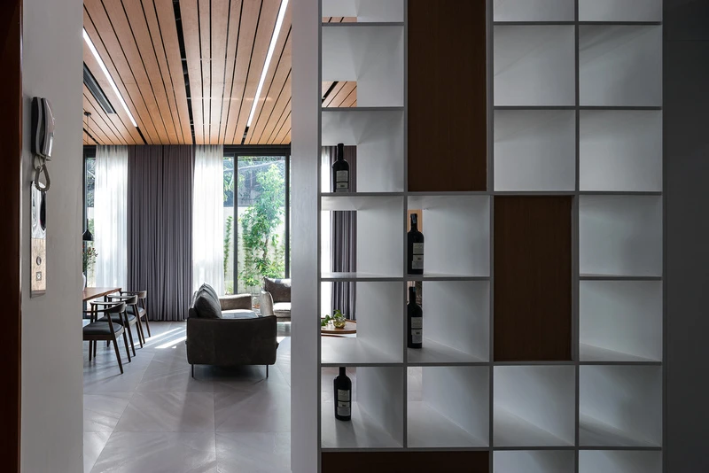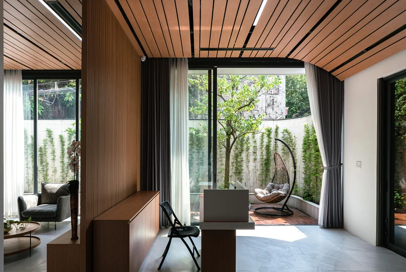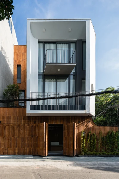 Nằm tại vị trí ngã ba trong một con hẻm tại Sài Gòn, nhóm KTS Vũ Hà Anh, Thân Tiến Hoàng, Lưu Thiện Tài, Nhân Quyền (MDA architecture) đã thiết kế hàng rào đặc ngăn cách giữa trong và ngoài để giảm tiếng ồn, đồng thời dấu được hệ cửa ra vào một cách khéo léo bằng mảng tường ốp gỗ.