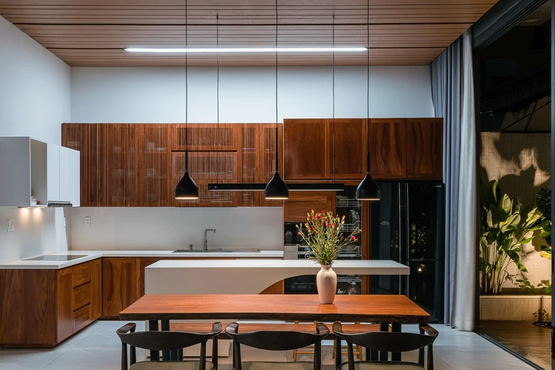 Trong đó, không gian phòng bếp hướng đến khoảng sân vườn xanh mát giúp con người hòa hợp với thiên nhiên.