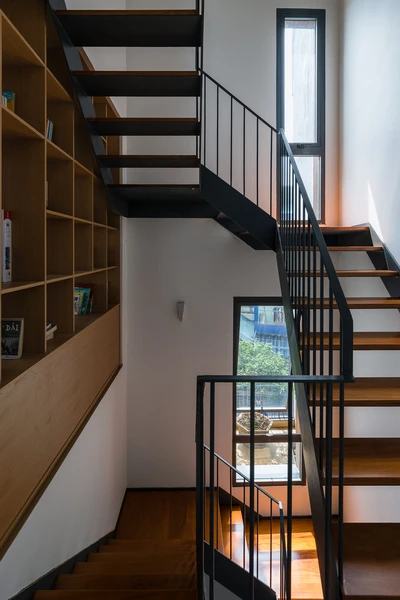 Ngoài ra, ở vị trí cầu thang KTS tạo điểm nhấn bằng cách tạo một kệ sách ở giữa lối đi.