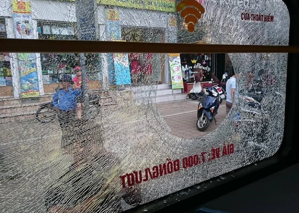 Chiếc xe buýt bị ném vỡ phần cửa thoát hiểm.