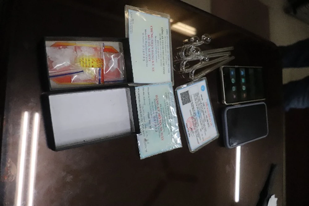 Qua đó, công an phát hiện trong túi xách màu xám của Luân có hộp giấy màu đen bên trong có bốn gói nylon chứa tinh thể không màu nghi là ma túy.