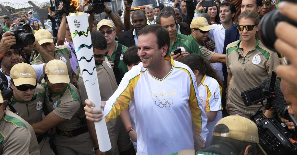 Thị trưởng Rio, ông Eduardo Paes cầm đuốc ở sự kiện Olympic Rio 2016. Ảnh: Getty