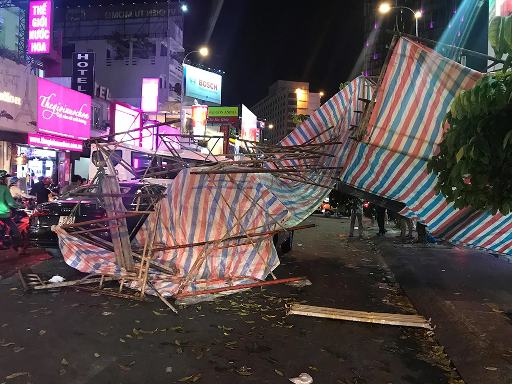 Giàn giáo một công trình bất ngờ đổ sập trên đường Cách Mạng Tháng 8 trong lúc trời mưa nhỏ và có gió. Ảnh H. Tâm.