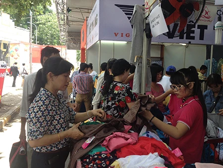 Trong ngày đầu khai mạc, gian hàng quần áo thu hút rất nhiều khách tham quan tìm tới.