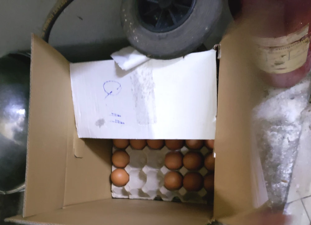 Trứng dùng chế biến thức ăn của Công ty TNHH Thương mại S để trên nền đất gần bột giặt. Ảnh: AT