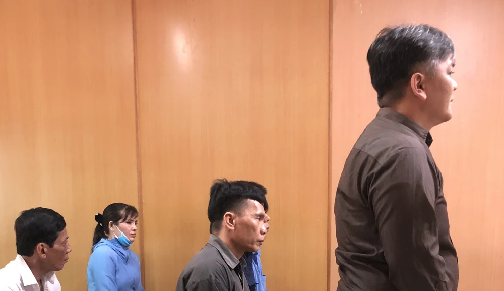 Bị cáo Tâm (đứng) cùng các đồng phạm tại toà. Ảnh: H.Y