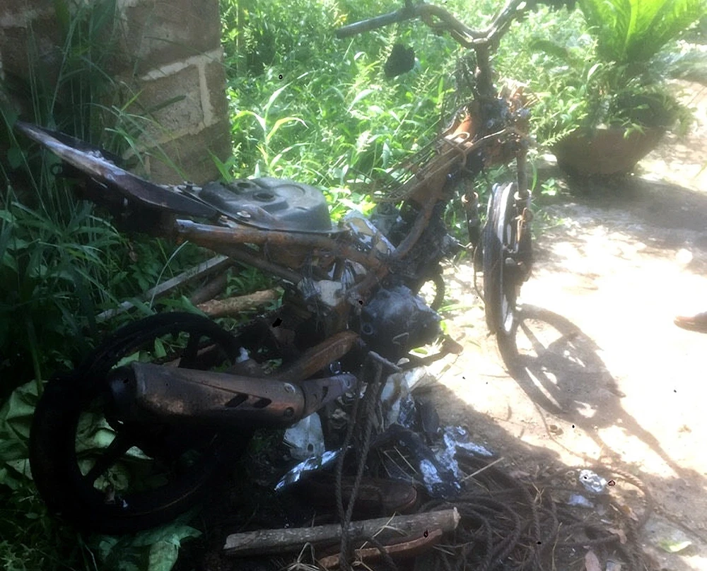 Chiếc xe của kẻ trộm chó bị dân làng đốt cháy rụi. Ảnh: LQL