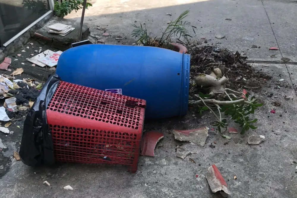 Chậu hoa vỡ, thùng rác... bị vứt vào trước cửa nhà bà H. Ảnh: NT